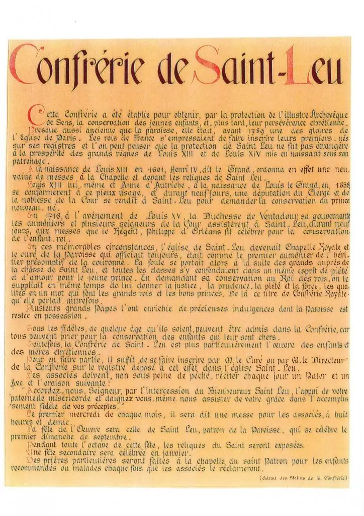 Plusieurs confréries furent créées à St Leu : la plus ancienne l’est par lettre patente de Charles VII en 1388 « Pour la santé des nouveaux nés et leur persévérance chrétienne ».