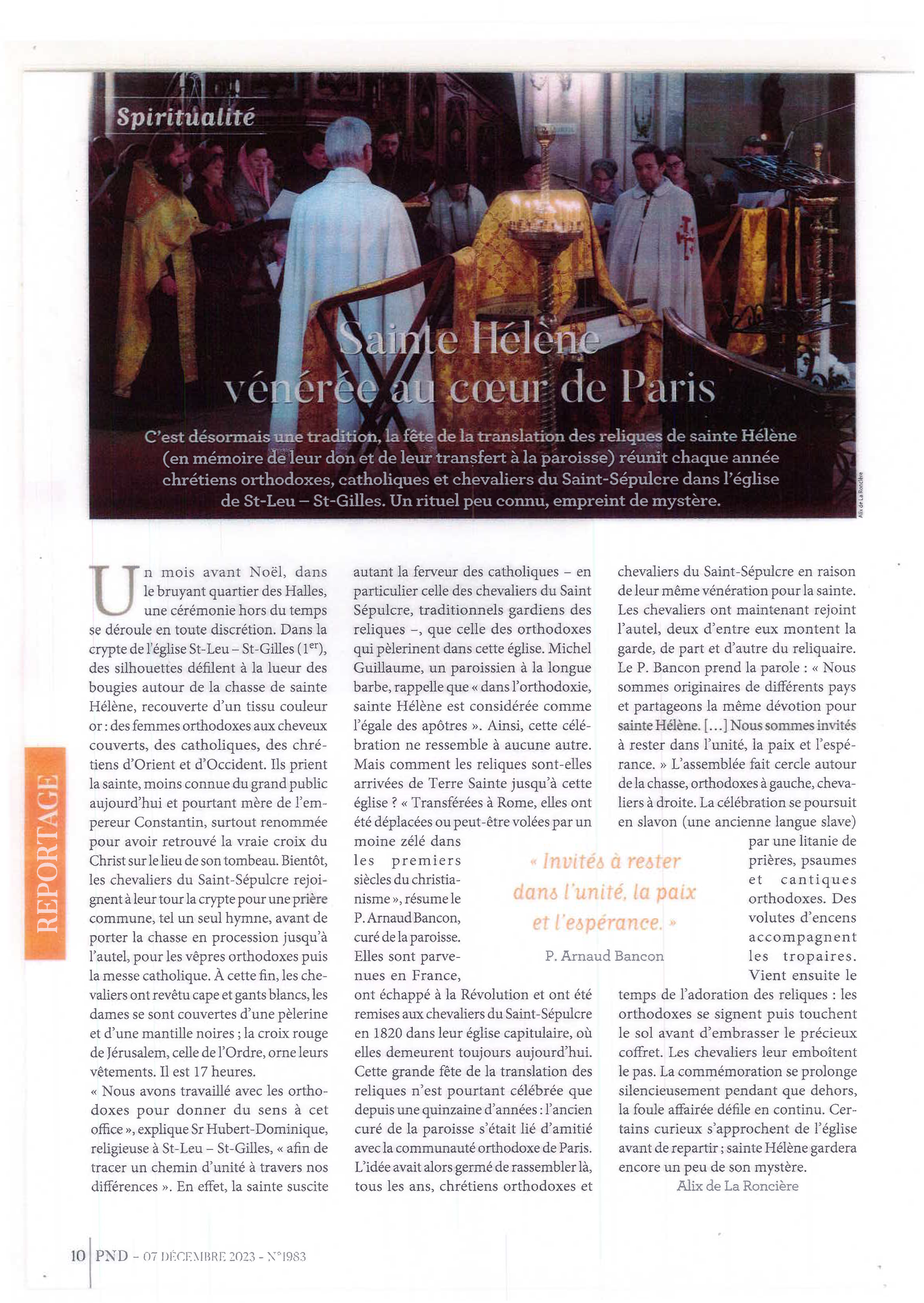 Dans l’église Saint Leu-Saint Gilles, rue St Denis à Paris, les reliques de Sainte Hélène sont présentes depuis 200 ans exactement. Elles sont vénérées par catholiques et orthodoxes.
